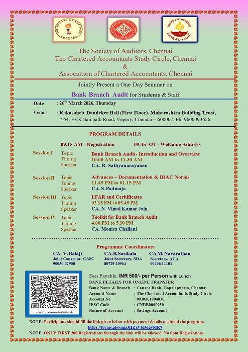 Speaker: CA. Prateek Mankad & CA. Girish Iyer | 28th March 2026 (Saturday) at 9.30 AM Venue: Mango Hill Central Chennai, 3, Thirumalai Pillai Rd, opposite Vidyodaya Schools, Darmapuram, T. Nagar, Chennai, Tamil Nadu - 600017 |