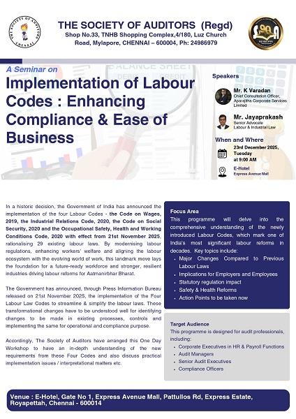 Registration Form: Click Here Program Details: The Society of Auditors is very happy to announce a One Day Workshop on the New Labour Codes which shall impact key changes to be made in HR & Personnel and other operational policies and procedures. These also have a significant change in compliance measures as well as in financial terms. The Workshop is scheduled on Tuesday, 23rd December 2025 at E-Hotel, Express Avenue Mall, Royapettah. Seasoned experts who have subject matter experience will be updating us and sharing their domain knowledge & perspectives. We also would ensure there is adequate time for Q&A session - which is so important to clear our doubts and enhance learning. The Brochure is appended below, and we request Chartered Accountants to register for the same as also share the programme details with their clients who could also benefit from attending this programme. We request you to register before the 18th of December so that necessary arrangements can be made accordingly. |