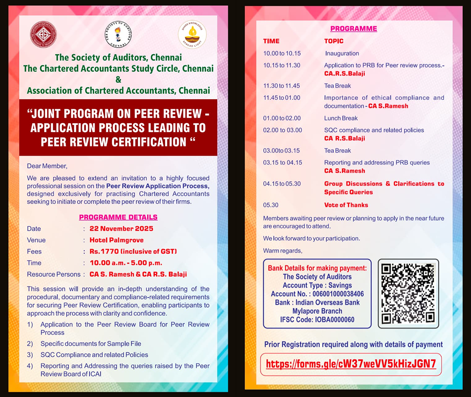 Speakers: CA S. Ramesh & CA R.S. Balaji | 22nd November 2025 (Saturday) at 10:00 AM to 5: 00PM Venue: Hotel Palmgrove |